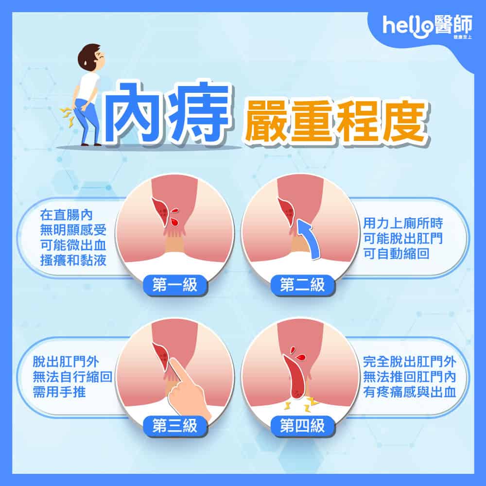 痔瘡症狀多為肛門不適,依嚴重度分級(1-4級),早期可自緩但易復發。