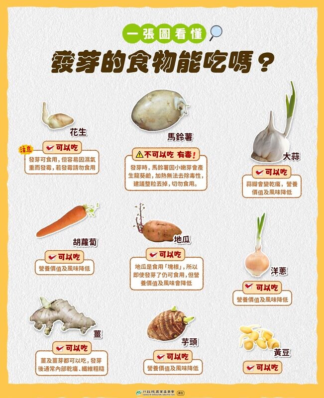 - 正常馬鈴薯茄鹼含量約每公斤50-100毫克安全,但發芽後可增5-6倍,超過安全值(每公斤200毫克),挖除芽眼仍殘留毒素。