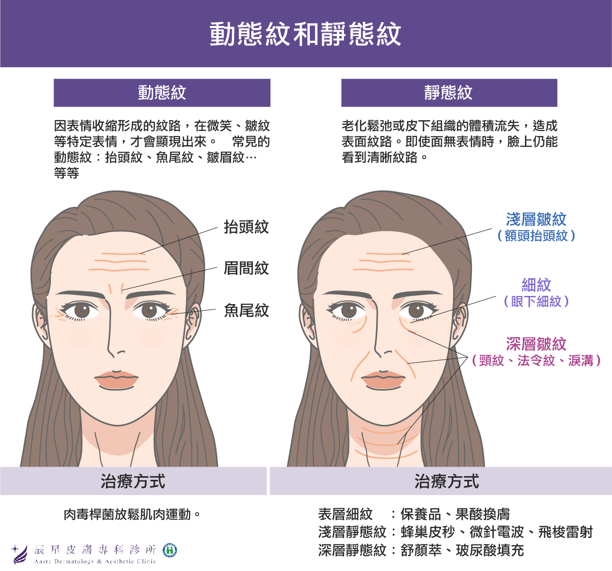 動態紋(又稱表情紋)是由臉部表情肌肉反覆收縮牽動皮膚所形成,例如抬頭時的抬頭紋、皺眉時的川字紋(皺眉紋)、笑時的魚尾紋等。
