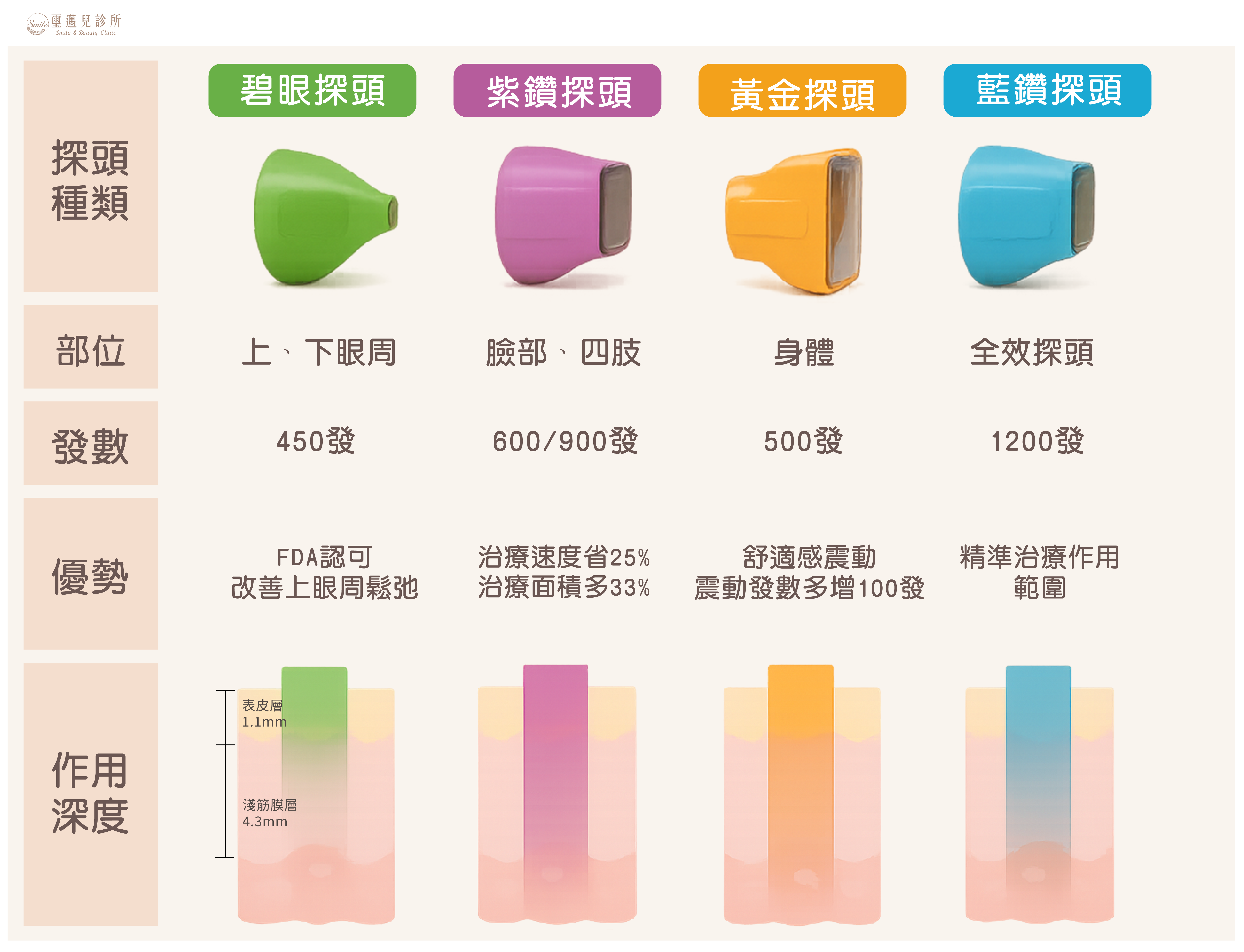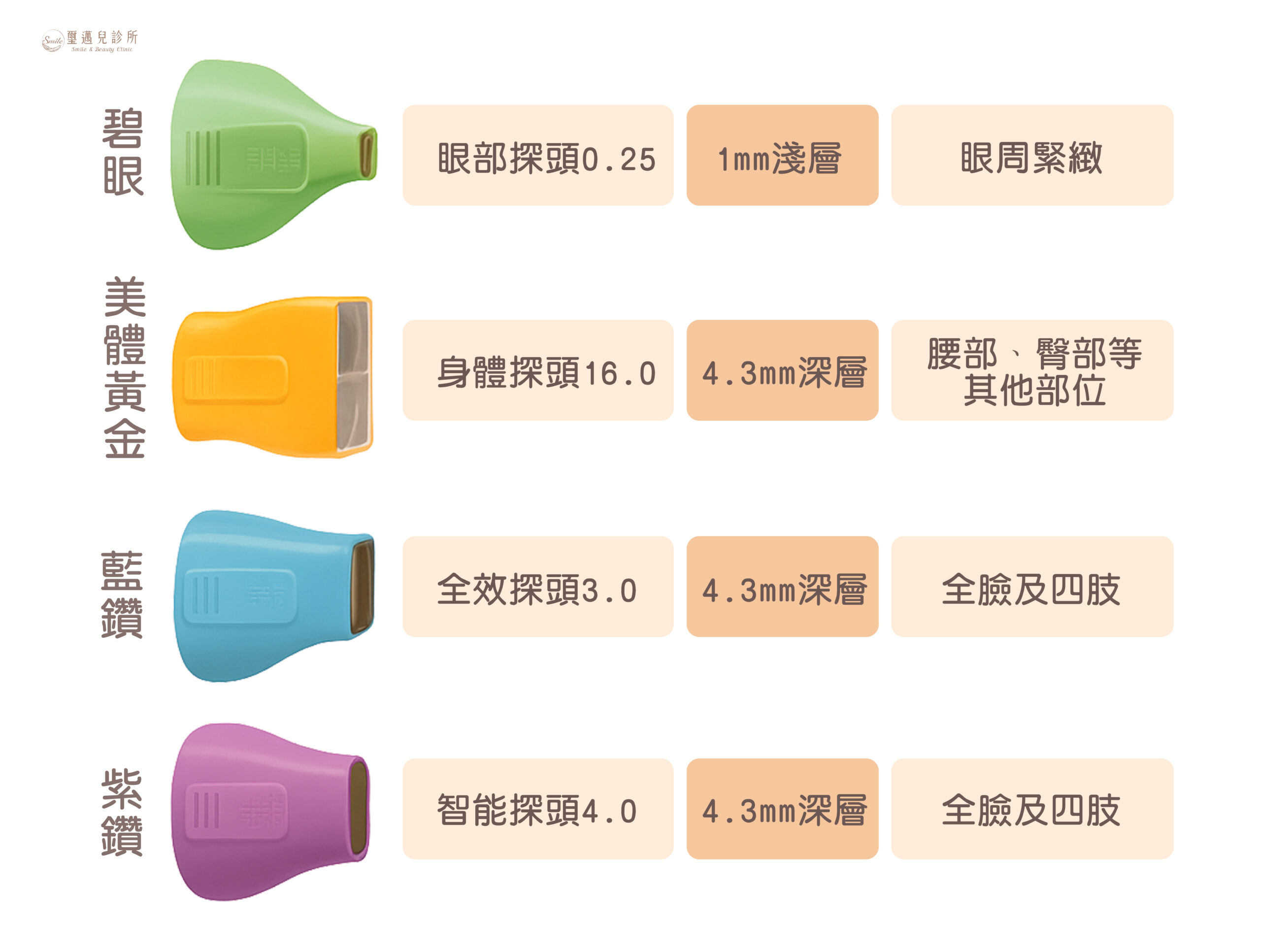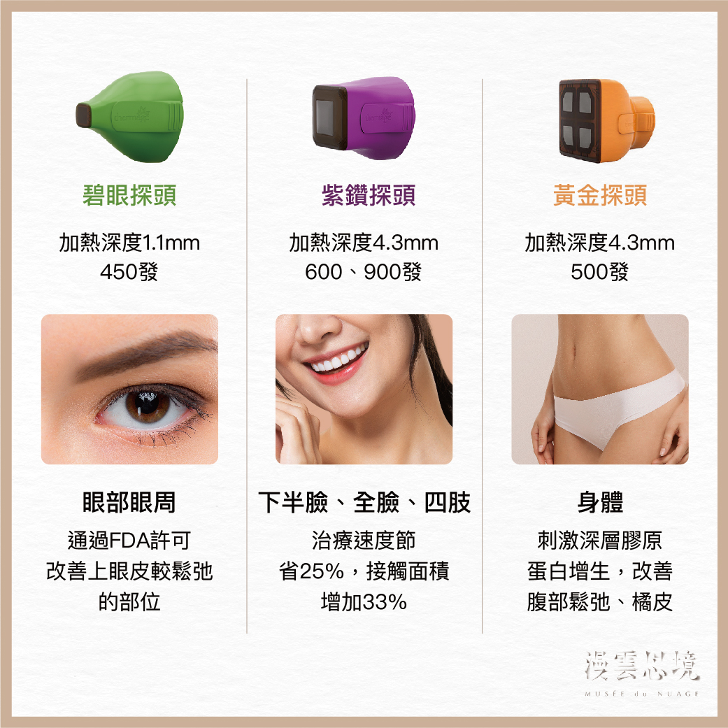 - 專為眼周薄嫩肌膚設計:探頭面積僅 0.25 cm²,治療深度約 1.1 mm,能量淺而集中,適合上眼皮、下眼瞼、眼尾等敏感區域,避免損傷角膜與鞏膜(治療時配戴眼盾)。