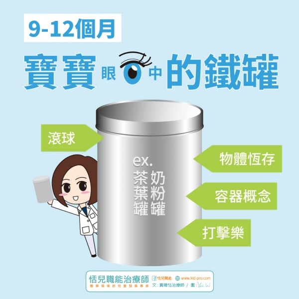 基本容器概念在寶寶9-12個月間開始發展。此時寶寶會開始把東西放進容器裡,例如把球丟到鐵罐中、把玩具放進箱子裡。到了快滿1歲到1歲半之間,孩子會特別喜歡玩將物品收入盒子的遊戲。
