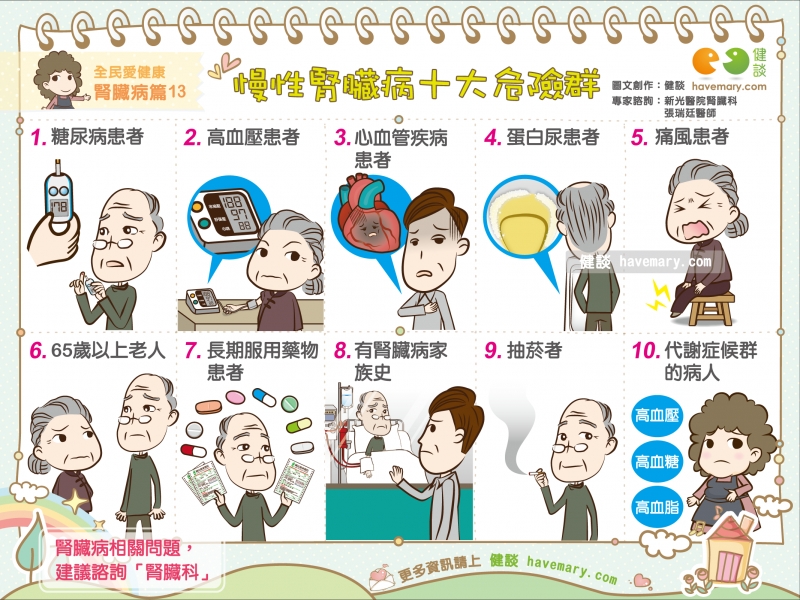 - 監測與控制:高危險群(糖尿病、高血壓、65 歲以上)定期抽血驗尿追蹤 GFR、蛋白尿;控制原發疾病、限蛋白磷鉀、避免加工食品。