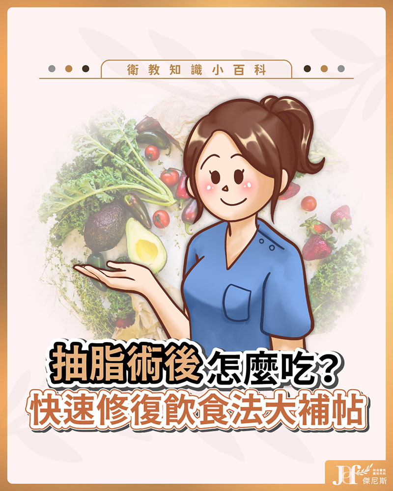 階段 飲食重點 術後7-30天 多蛋白質、蔬果、魚湯,減少澱粉,助消腫修復肌肉 術後30天起 早餐多蛋白質,均衡飲食維持體態,避免脂肪累積