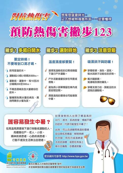 - 注意自身及周遭(老人、小孩、戶外工作者)症狀,如頭暈、噁心,立即休息、降溫、求醫。