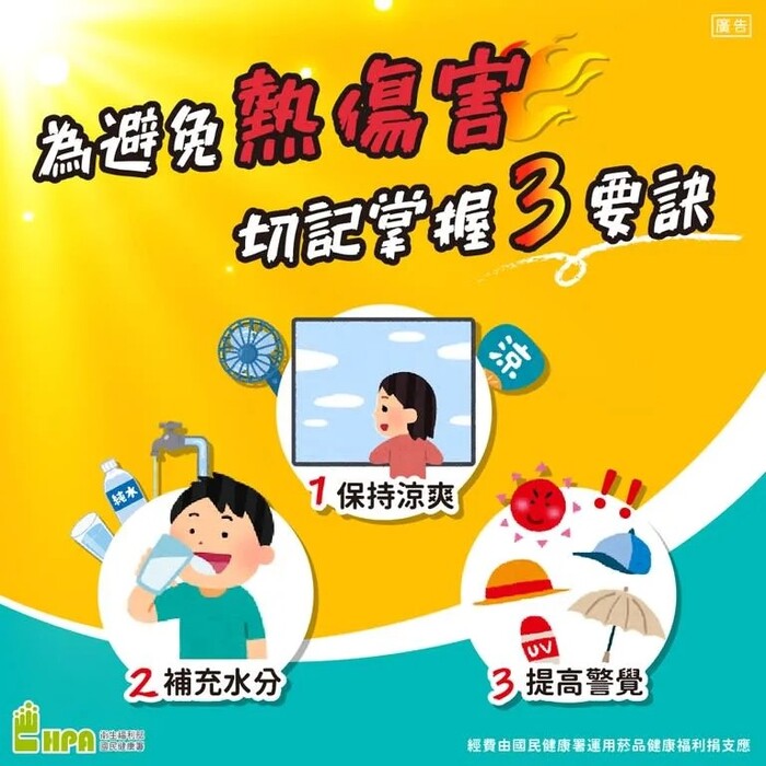 在高溫多濕環境下,應遵循防熱傷害三要訣「涼、補、心」,避免熱傷害、食品中毒及環境風險,主要針對一般民眾、弱勢族群及戶外工作者。