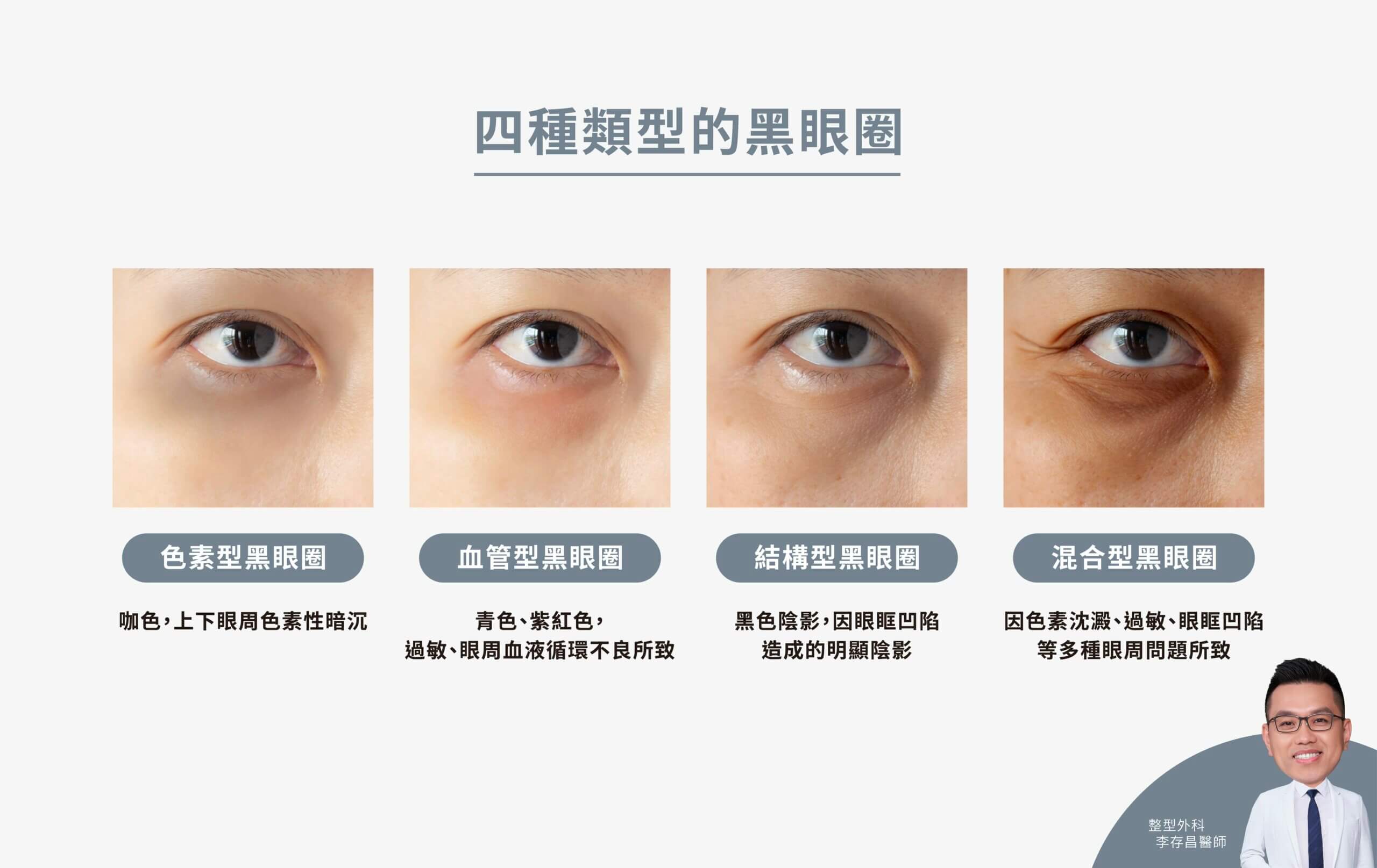 | 色素型 | 咖啡/棕/褐色 | 上下眼皮 | 黑色素沉澱(先天或後天,如曬太陽) | 全天固定,曬後加深 |
