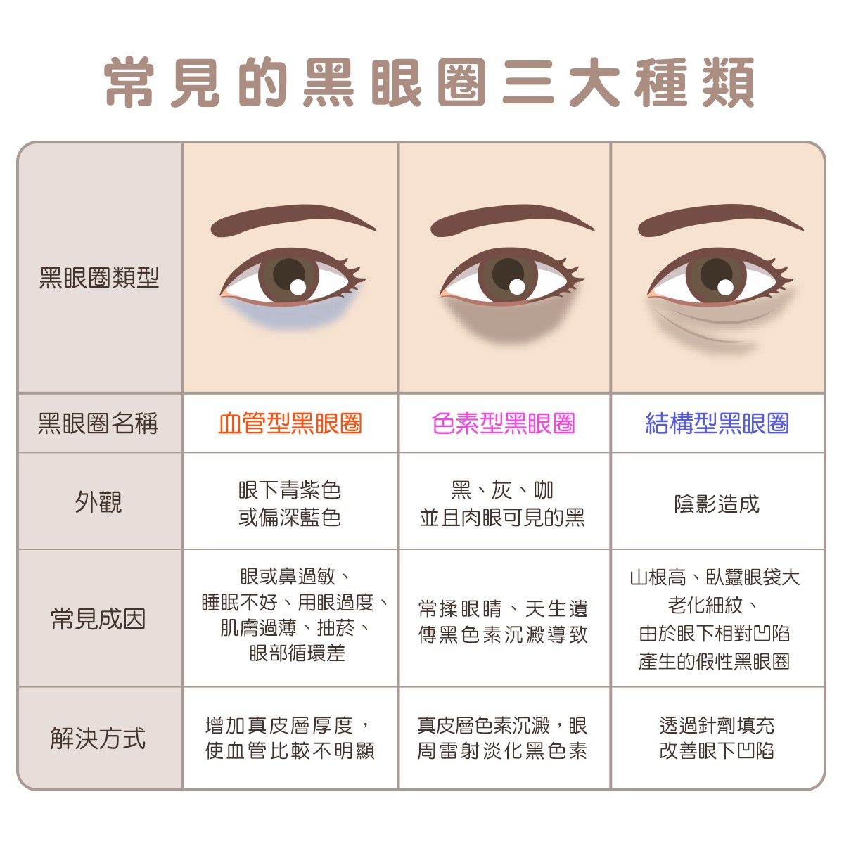 - 辨識黑眼圈:輕按若顏色不變(非陰影型),多為色素或循環問題。