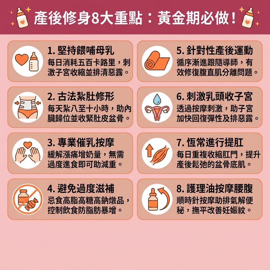- 禁忌:高衝擊運動、過度腹訓;哺乳後運動避免脹痛;不適立即停止,補水觀察身體。
