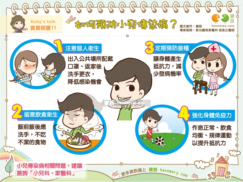 - 勤洗手:進門後立即洗手、換衣,擤鼻涕或上廁所後洗手,避免用手觸摸眼睛、鼻子、嘴巴或小孩物品,防止接觸傳染。