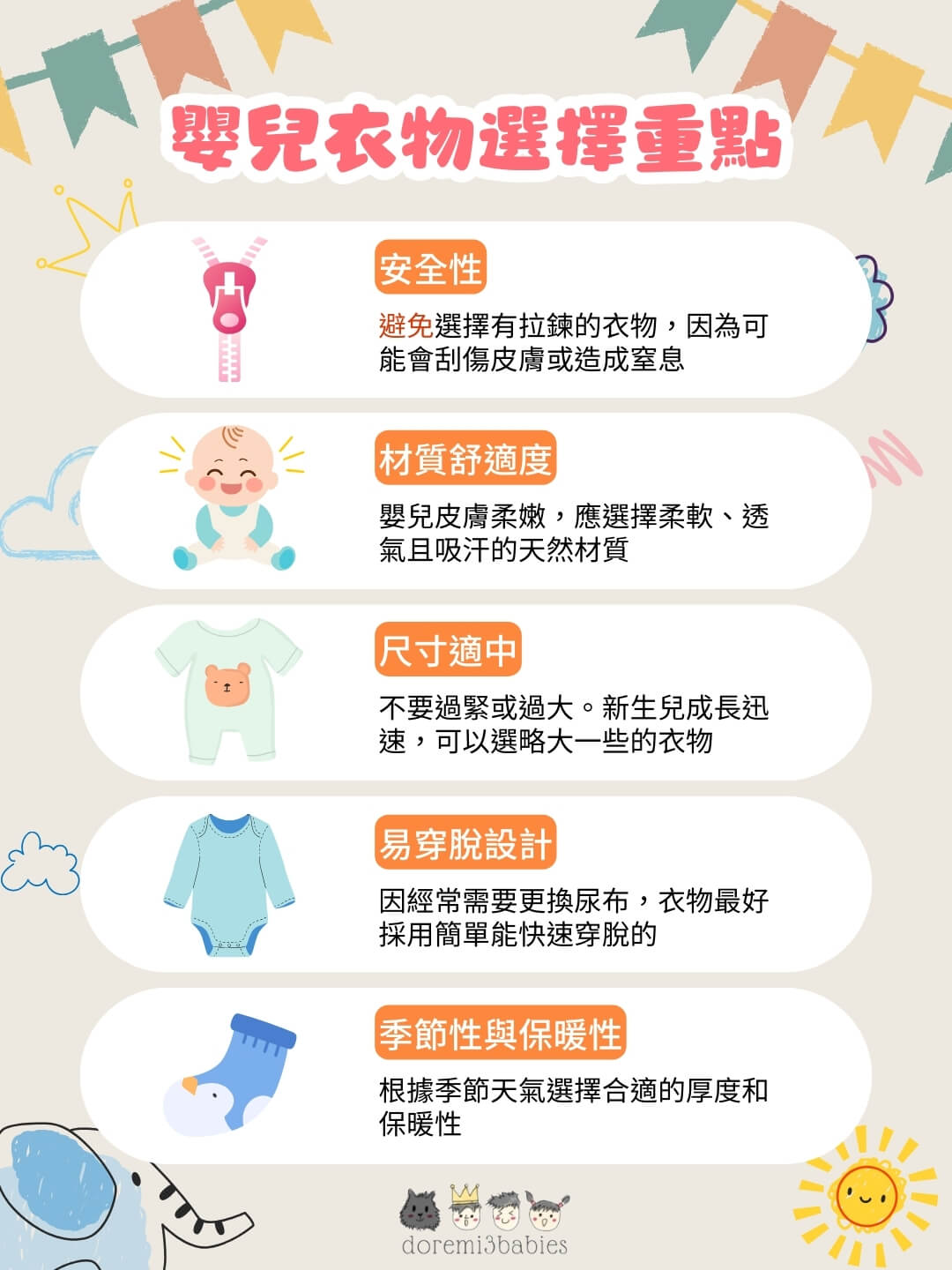 - 衣:適合季節的嬰兒服飾。