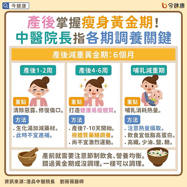 均衡攝取全穀根莖類、豆魚肉蛋類、蔬菜水果、低脂乳品及油脂類,並根據是否哺乳調整熱量需求,哺乳媽媽每日約需2100大卡,未哺乳者約1600大卡,避免過量進食。 -