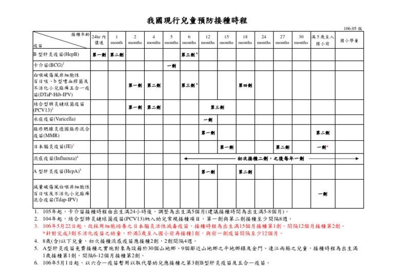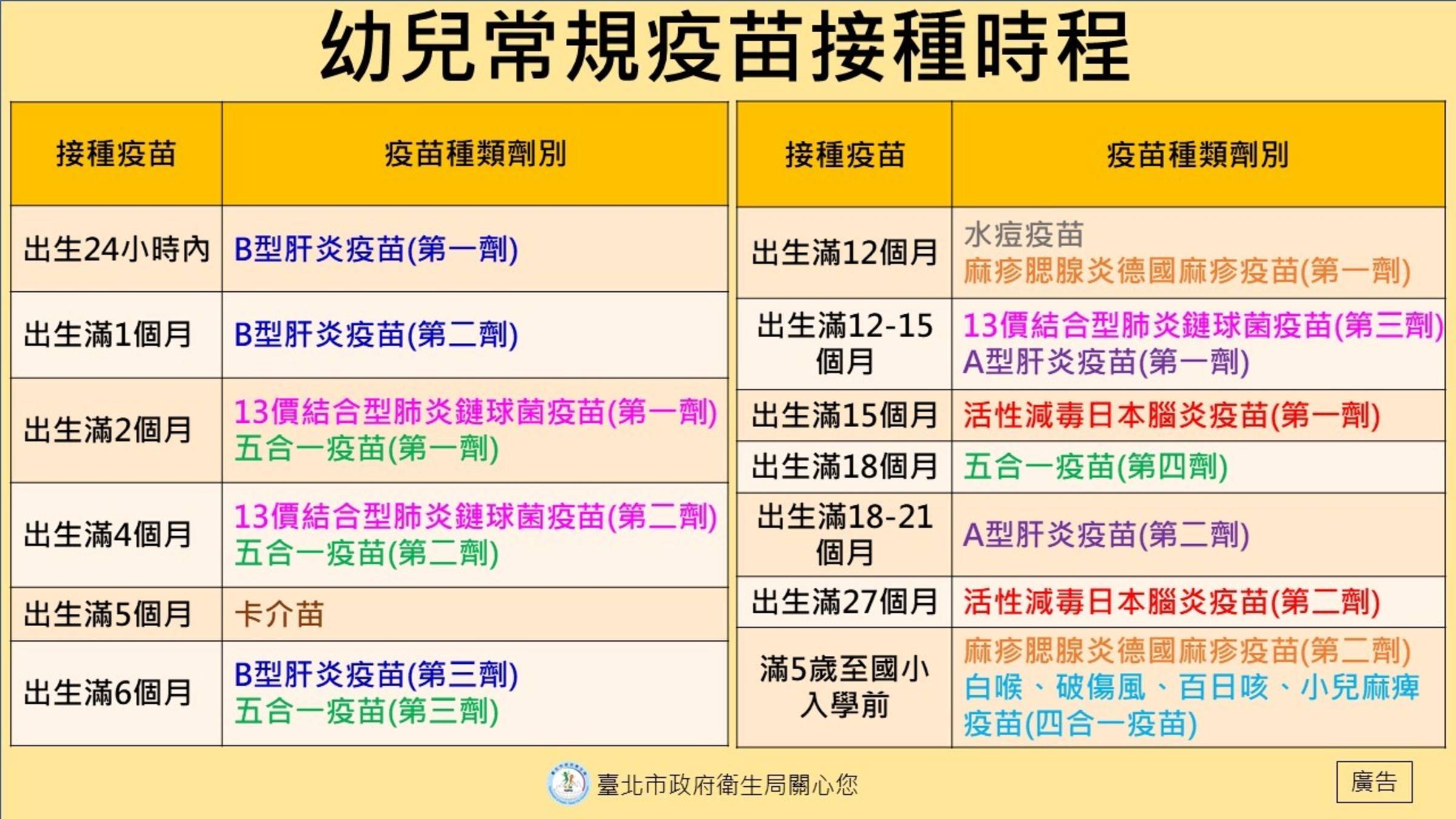 日本腦炎疫苗:自2017年5月22日起,常規接種時程為出生滿15個月接種第1劑,間隔12個月接種第2劑。若尚未完成,建議於入學前補足。