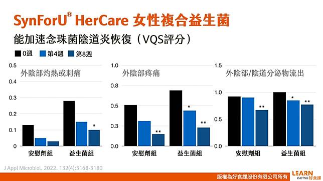 一項針對78名患有念珠菌感染的孕婦所進行的隨機雙盲對照試驗中,受試者連續8週每日服用特定益生菌(SynForU(R)-HerCare)或安慰劑。結果顯示,服用益生菌組的女性私密處分泌物顯著減少,外陰部搔癢情況明顯改善,且排便次數增加,顯示益生菌不僅能舒緩因念珠菌感染造成的私密處不適症狀,還能降低陰道炎復發率並改善消化道功能。