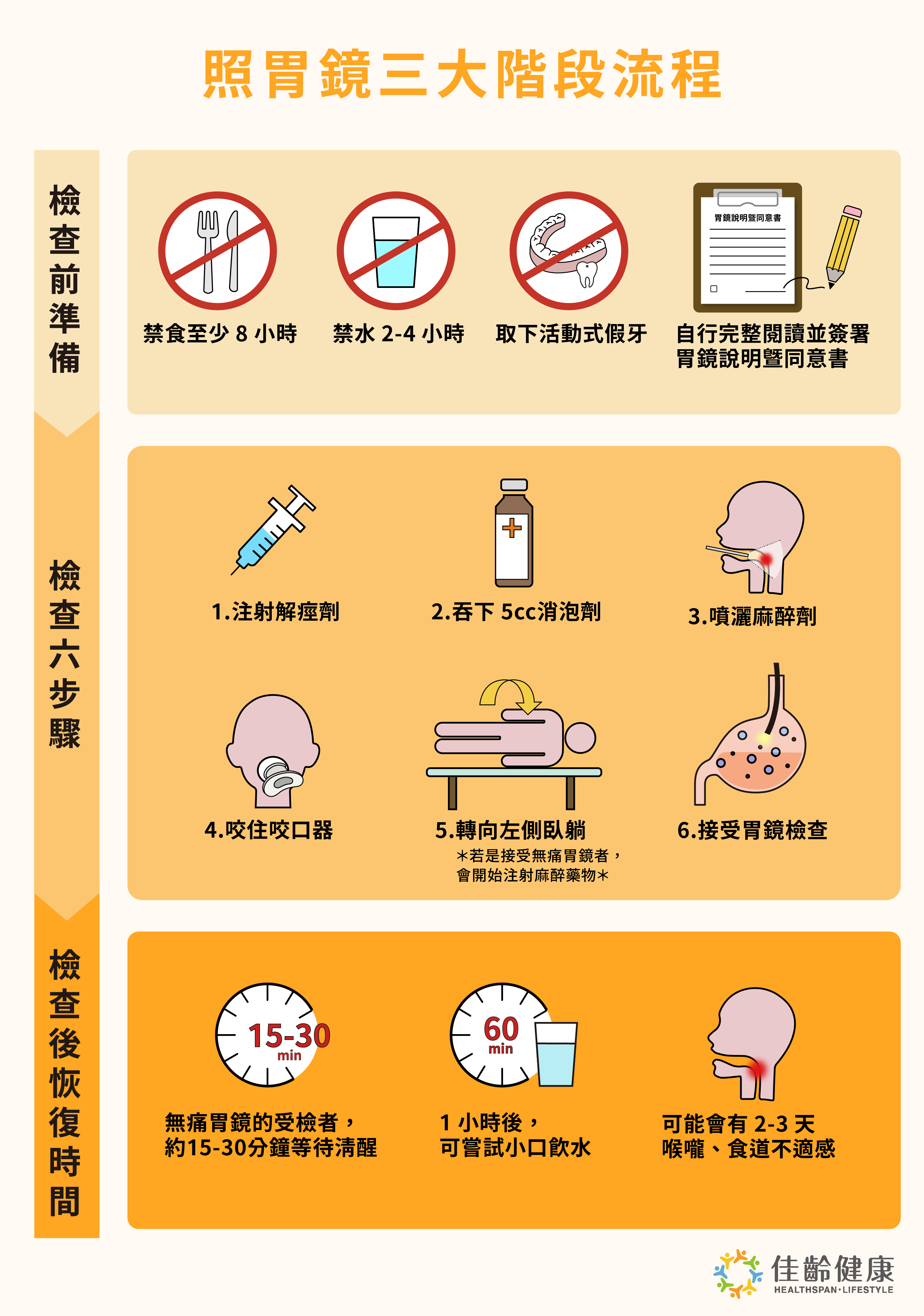 - 檢查前會注射解痙劑降低腸胃蠕動,並吞服消泡劑減少胃內氣泡,提升檢查視野。