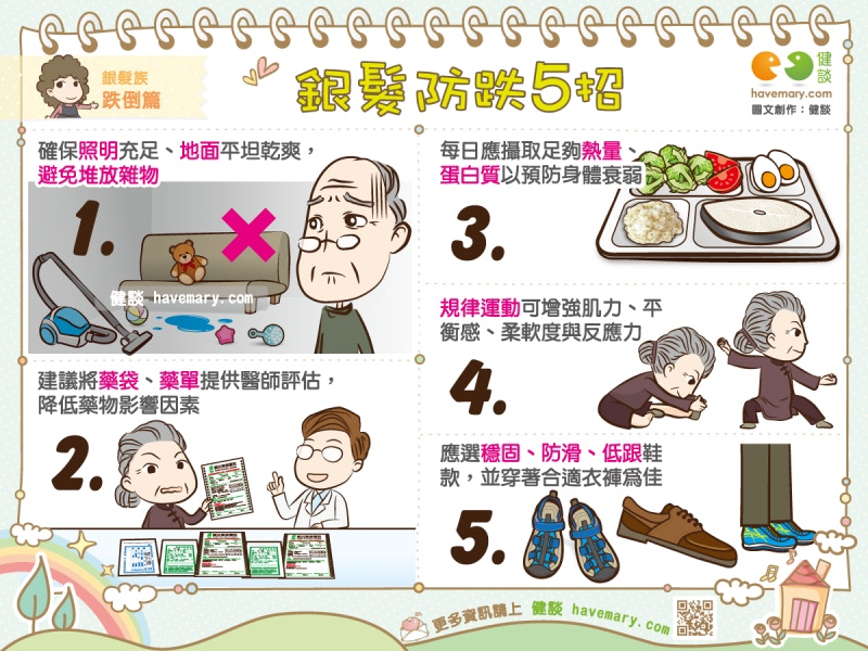 - 常見疾病如心臟病、中風、高血壓、糖尿病、關節炎、巴金森氏症、慢性呼吸疾病、大小便失禁等,都會增加跌倒風險。