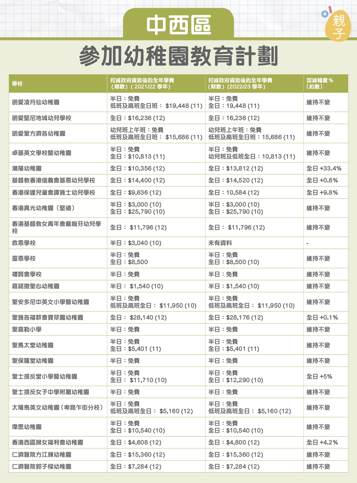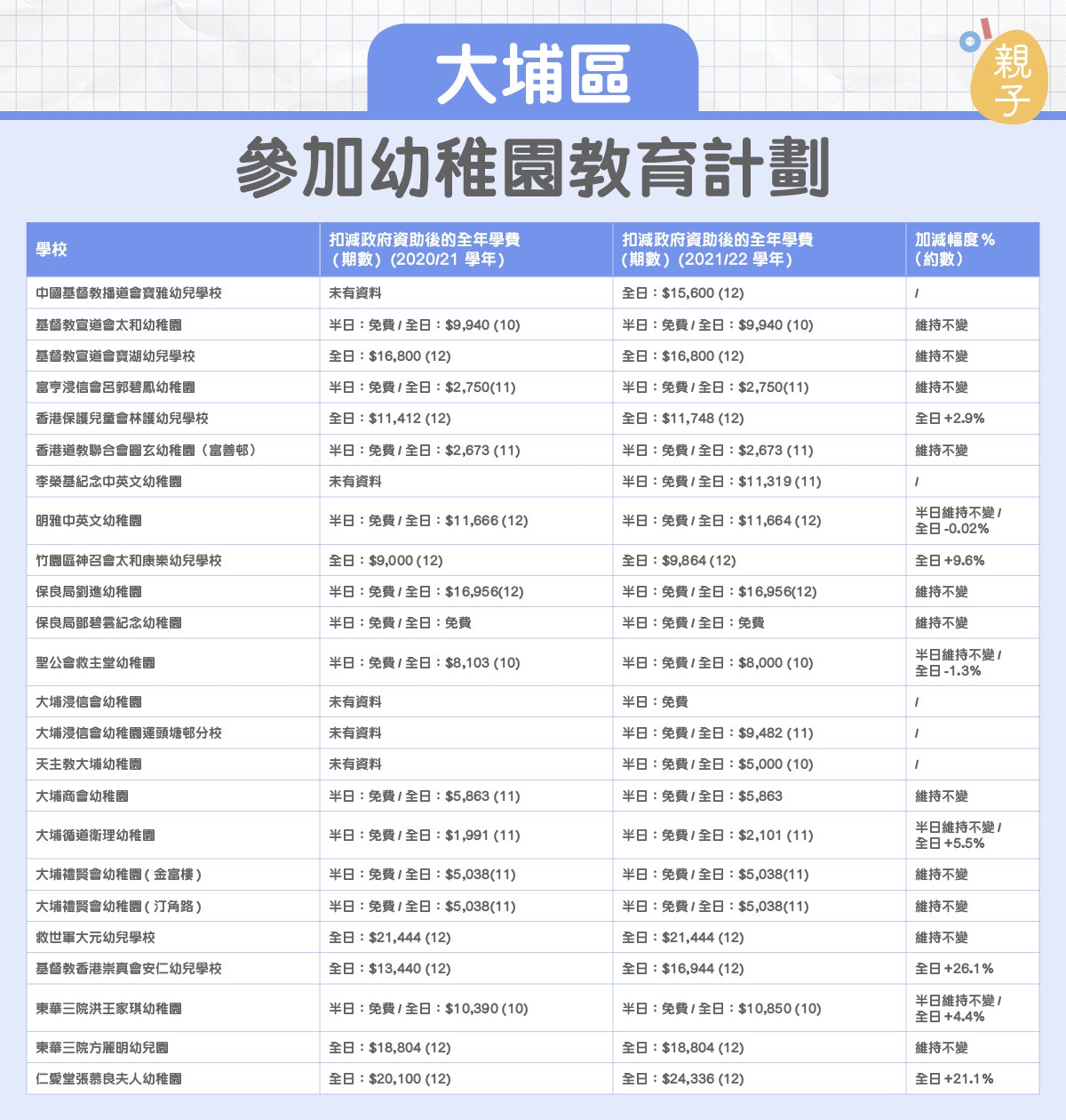 家長可透過「幼稚園及幼稚園暨幼兒中心概覽」或「全國教保資訊網」查詢幼稚園是否參加政府的幼稚園教育計劃及其學費詳情。這些平台會列出各幼稚園的收費標準及相關資料,方便家長比較。 -