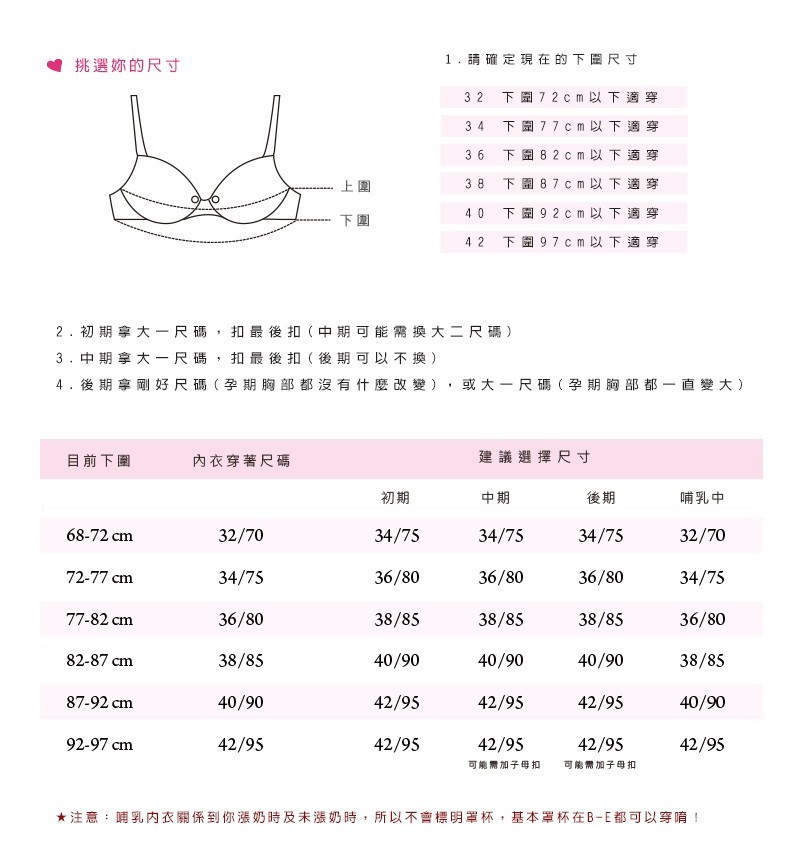 哺乳內衣應以貼合下胸圍尺寸為主,方便哺乳且能承托胸部重量。
