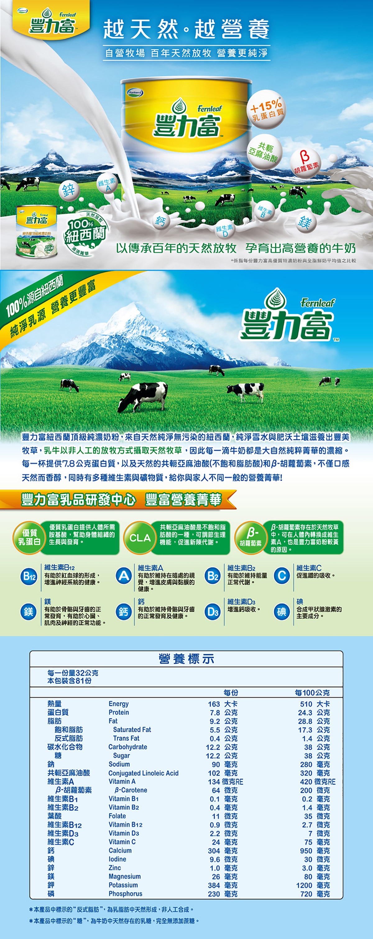 - 來源: 豐力富奶粉的乳源來自紐西蘭,這是一個以天然環境和純淨水源聞名的國家。紐西蘭的溫和氣候和自然環境提供了優質的牧場條件,讓乳牛能夠以新鮮牧草為食,健康生長。