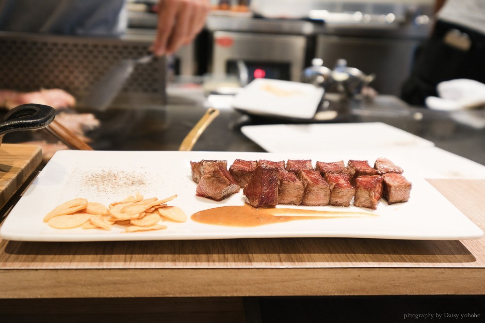 食材選用講究且多樣:主打使用頂級活海鮮(如活鮑魚、澳洲水姑娘龍蝦)、當季時令蔬菜(如白蘆筍、白鯧魚)以及在地特色食材,強調食材的新鮮與品質,並透過鐵板燒的烹調方式,保留食材的鮮甜與自然風味。