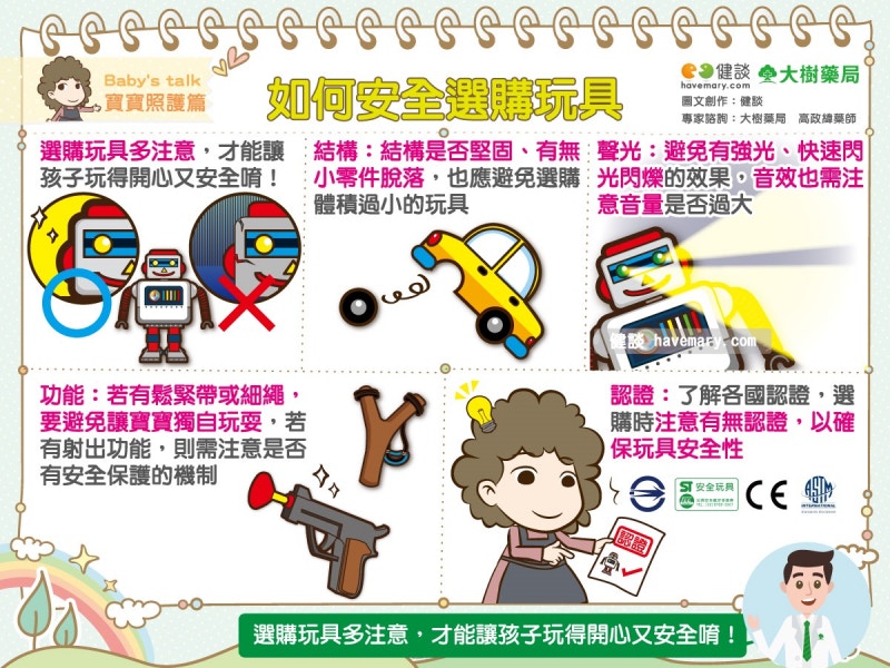 選擇有安全認證標章的產品,避免購買無標示或來源不明的廉價玩具。
