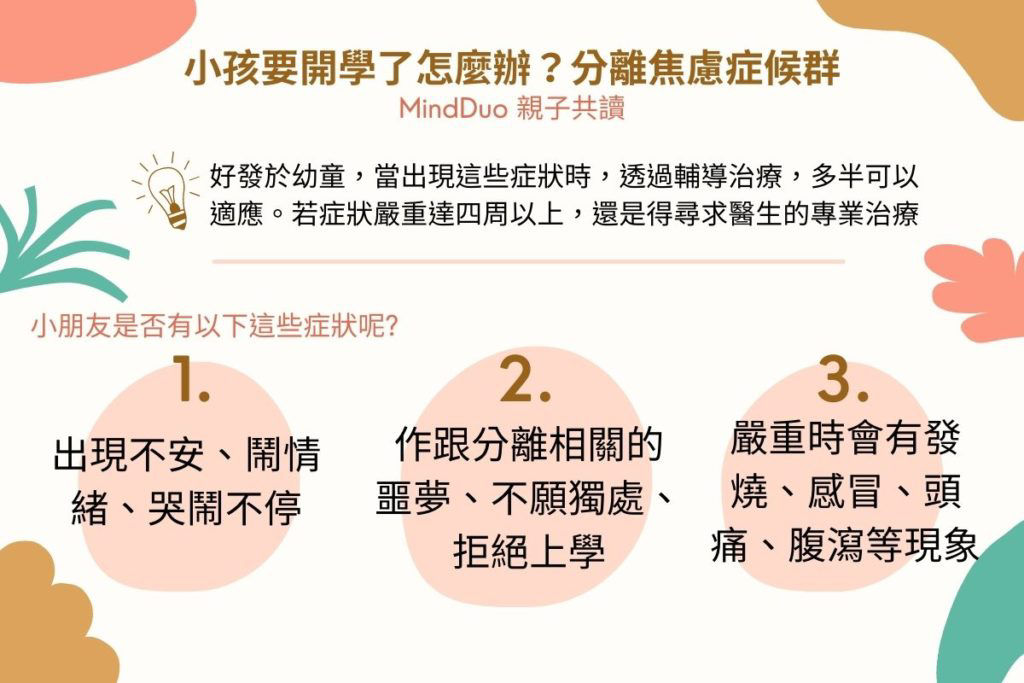 - 若分離焦慮反應過於強烈、持續時間過長,甚至影響孩子的日常生活與發展,可能需要專業評估與治療。