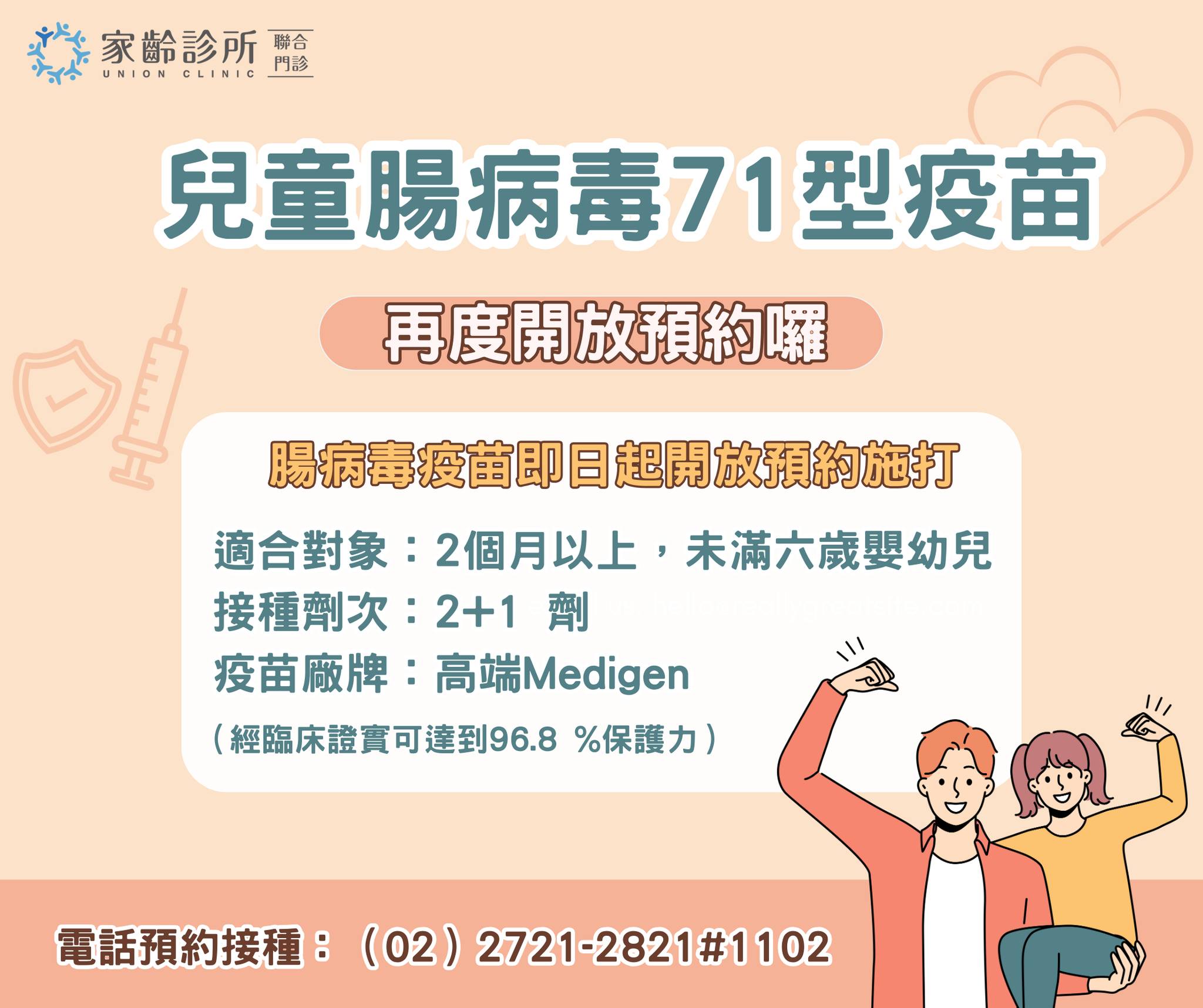 預約接種腸病毒71型疫苗的方式通常是通過電話或網路預約。例如,家齡兒科的預約電話是(02)2721-2821#1102,同時也提供網路預約掛號服務。