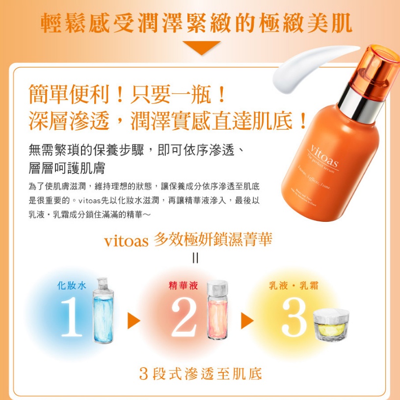 三得利小橘瓶(vitoas蜜得絲多效極妍鎖濕菁華)是一款All-in-One多效保養品,結合了化妝水、精華液、乳液及乳霜的成分,能一次完成多道保養程序,適合想要簡化保養步驟的人使用。