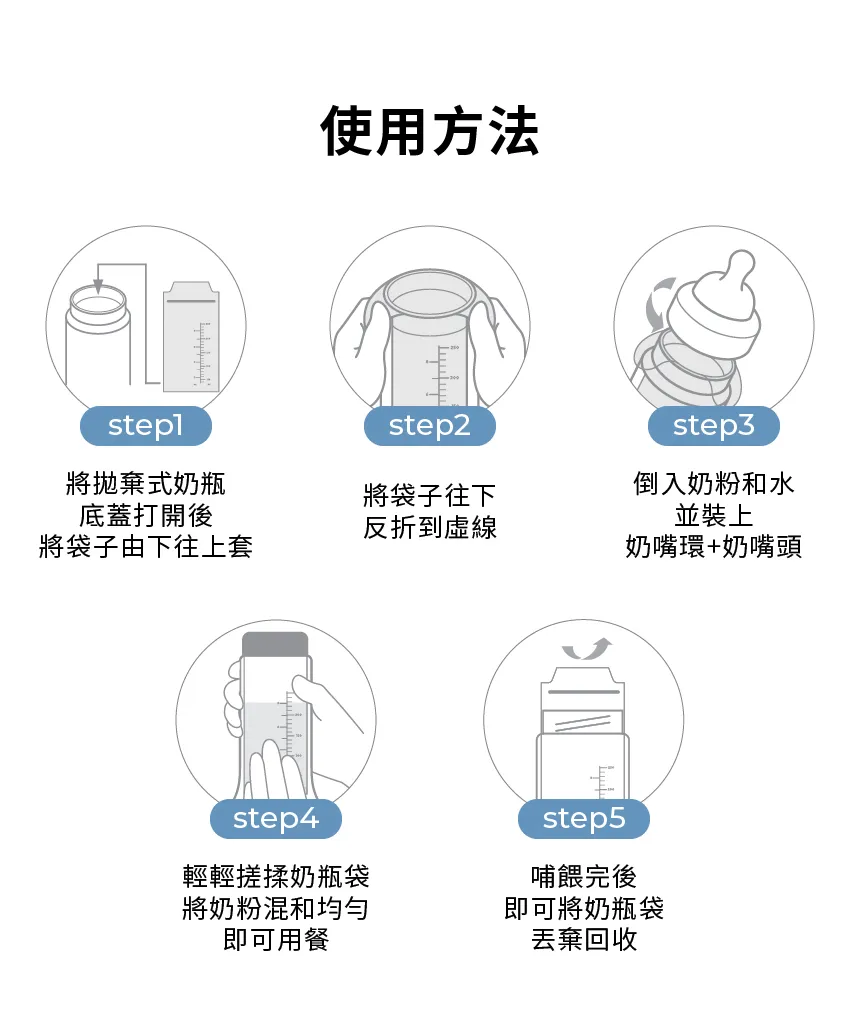 - 使用後處理:使用完畢後,奶瓶袋可直接丟棄,奶瓶本體則可清洗消毒後重複使用。