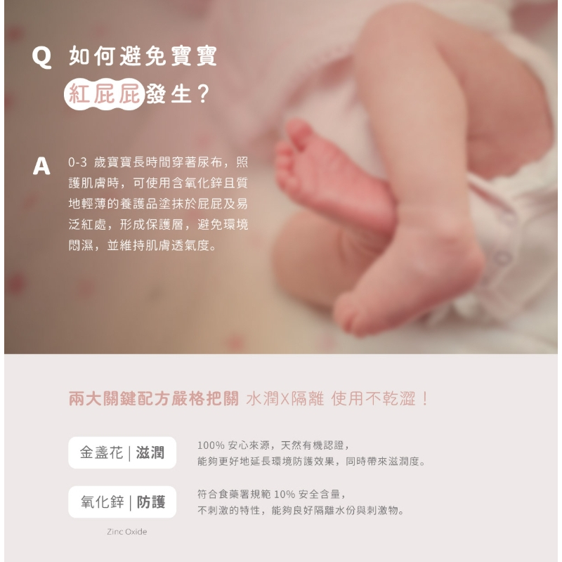 成分與功效:常見含氧化鋅成分(約9.5%至15%不等),具預防與舒緩尿布疹功效。部分產品添加羊毛脂、蜂蠟、酪梨複合活源醣等滋養修護成分,強調預防、舒緩與修護三重功效。