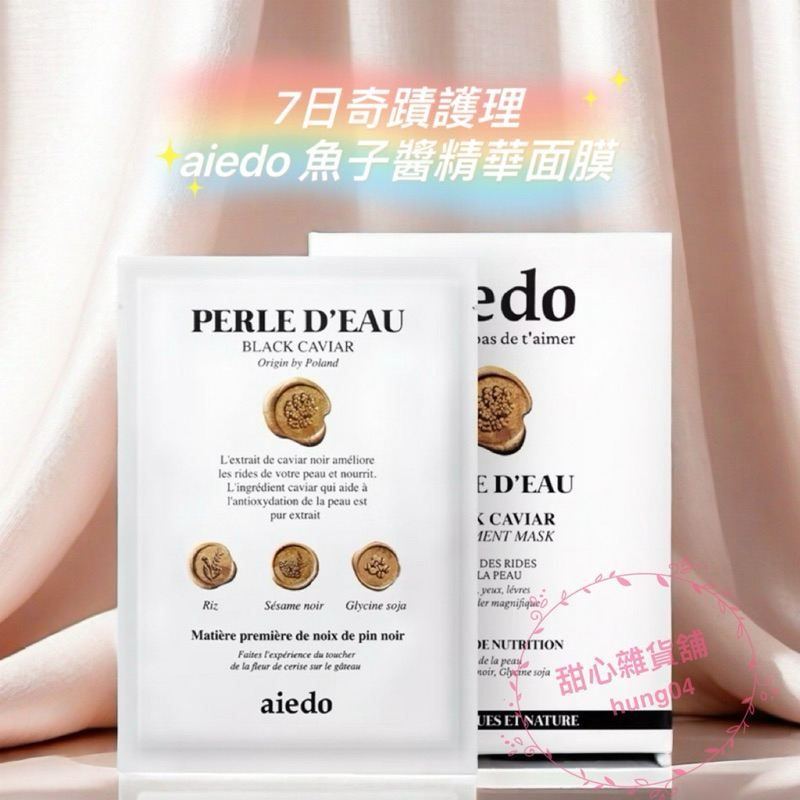 | aiedo 7日奇蹟面膜系列 | 緊緻、亮白、深層滋養、修護肌膚 | 高濃度魚子醬精華、白松露精華、雙重玻尿酸、積雪草苷 | 一盒7片,約NT1,640 | 敷感輕透服貼,精華滲透迅速,7天內明顯緊緻彈潤與亮白光澤,適合需要全方位修復的肌膚 |